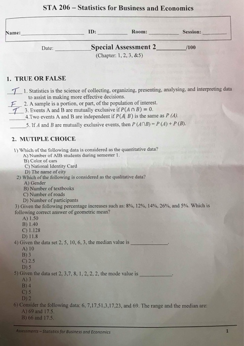 Solved Sta 206 Statistics For Business And Economics Id Chegg Com